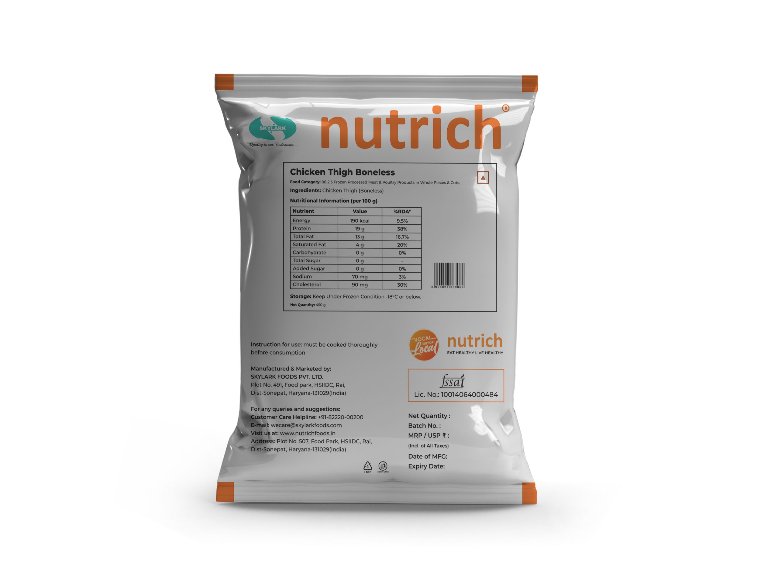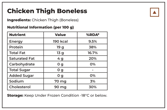 Chicken Thigh Boneless Nutritional Information:| Energy (Kcal) | 190 |
